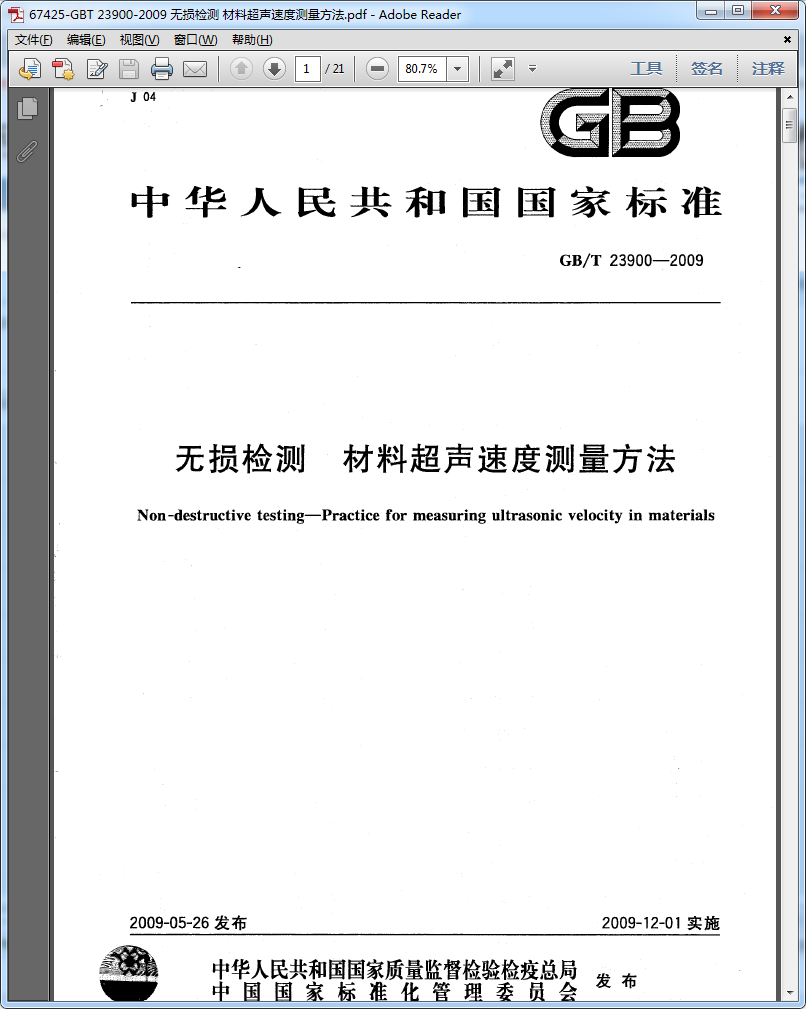 GB/T 23900-2009 無損檢測 材料超聲速度測量方法