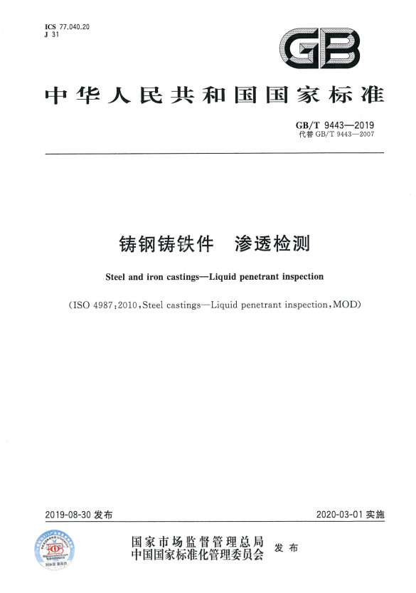 GBT 9443-2019 鑄鋼鑄鐵件滲透檢測