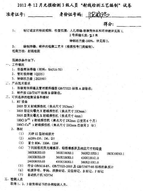 學會3級工藝卡試卷-射線