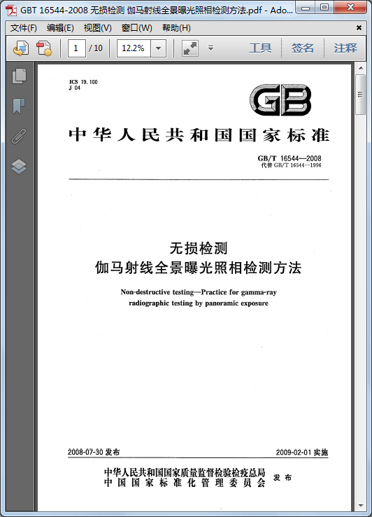 [GB/T 16544-2008]無損檢測 伽瑪射線全景曝光照相檢測方法