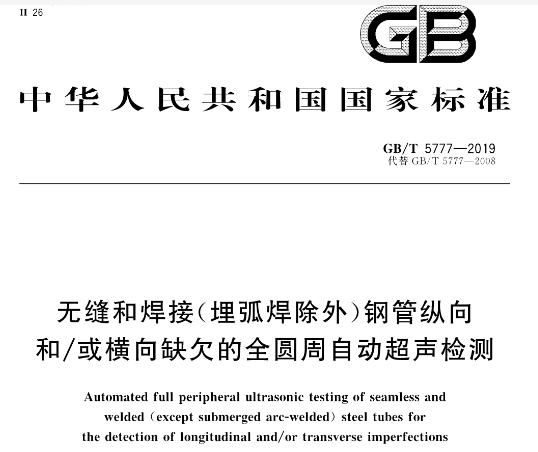 資料名稱: GB∕T 5777-2019 無縫和焊接(埋弧焊除外)鋼管縱向和∕或橫向缺欠的全圓周自動超聲檢測