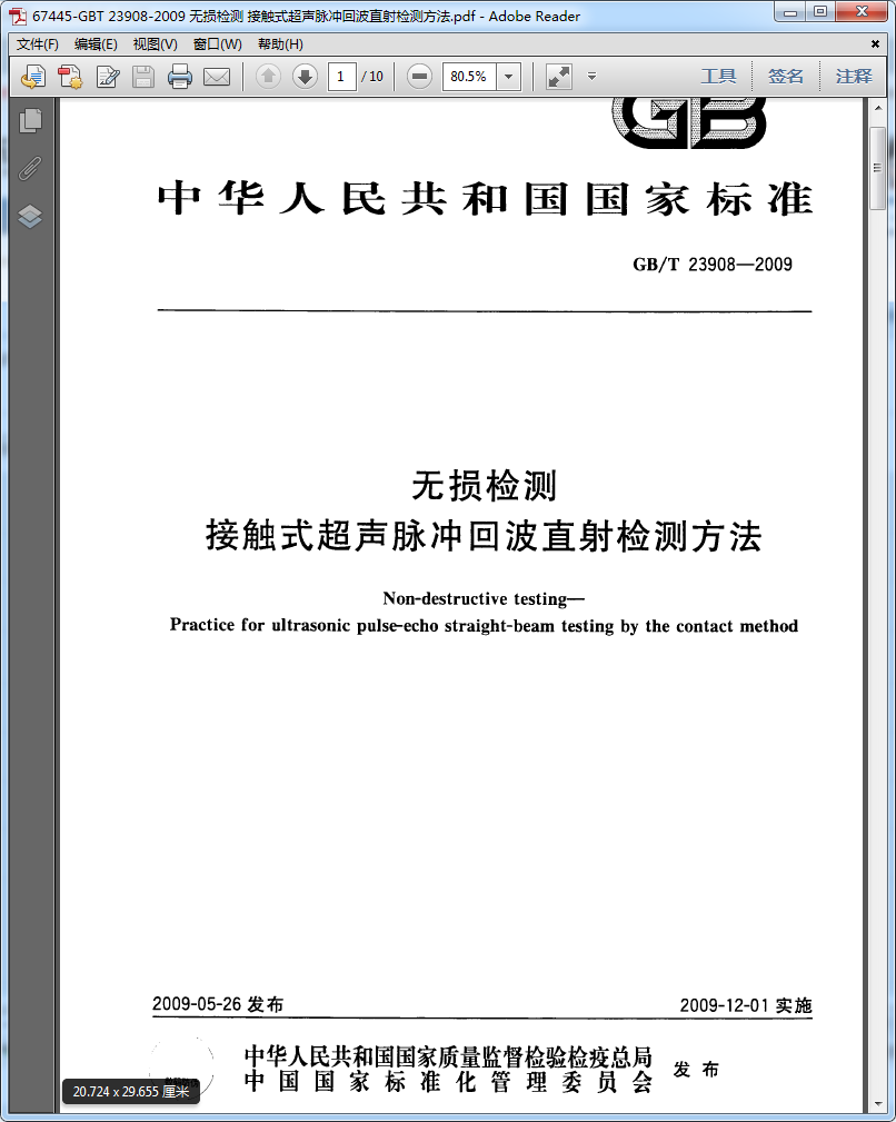 [GB/T 23908-2009]無損檢測 接觸式超聲脈沖回波直射檢測方法