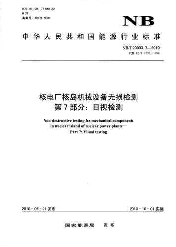 NB/T 20003.7-2010 核電廠核島機械設備無損檢測 第7部分:目視...