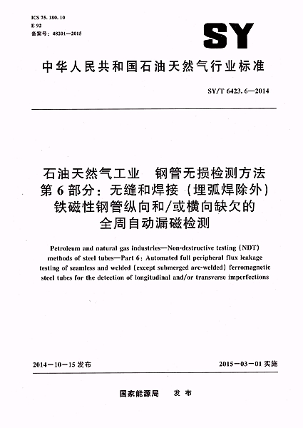 標準名稱: 石油天然氣工業 鋼管無損檢測方法 第6部分:無縫和焊接(埋弧焊除外)鐵磁性鋼管縱向和∕或橫向缺陷全周自動漏磁檢測